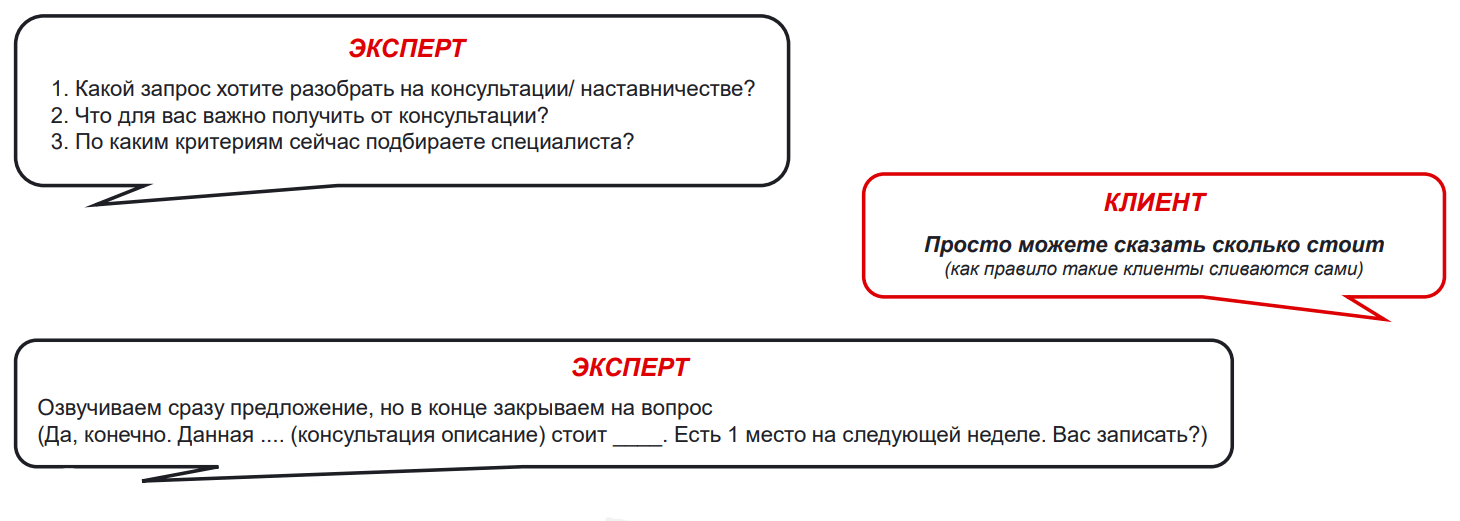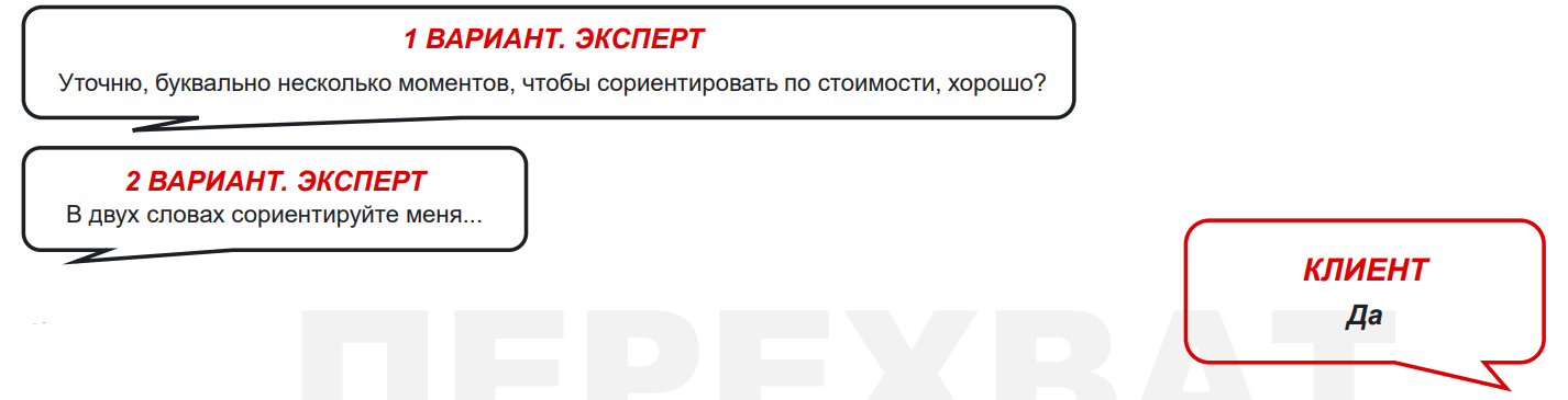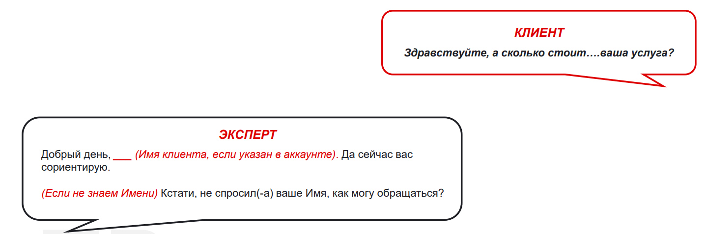 Обычно важно спросить про запрос клиента и про результат, который он хочет получить. . Если клиент отказывается отвечать на вопросы, называем стоимость, но обязательно задаём вопрос в конце, чтобы закрыть на следующее действие.