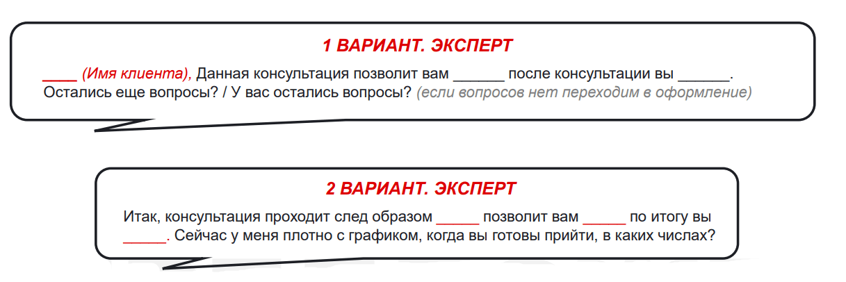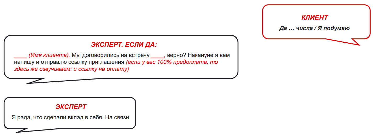 Здесь мы подводим клиента к оплате или договариваемся о следующем шаге.