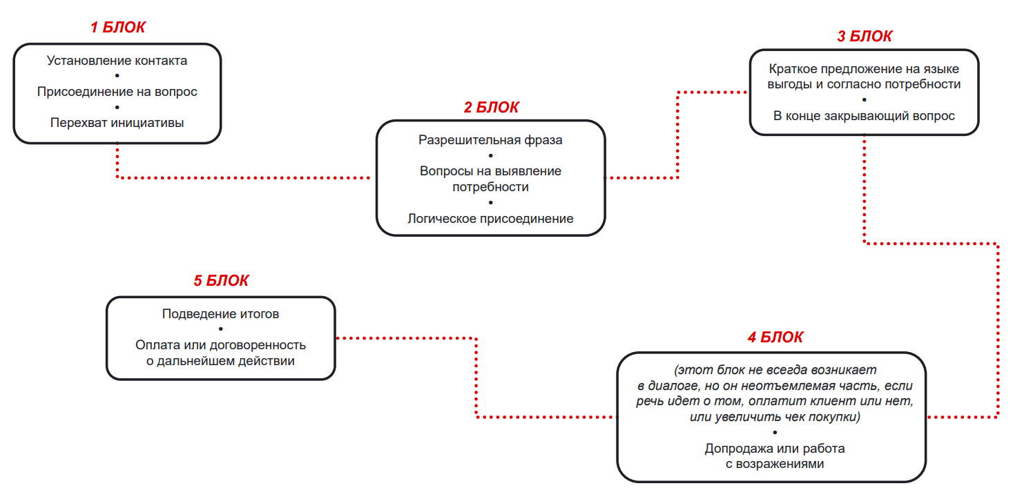 На картинке вы видите пример скрипта продаж для менеджера. Посмотрите, что происходит: мы задаём вопросы клиенту, чтобы прояснить запрос, но обязательно объясняем, зачем мы всё это спрашиваем.
