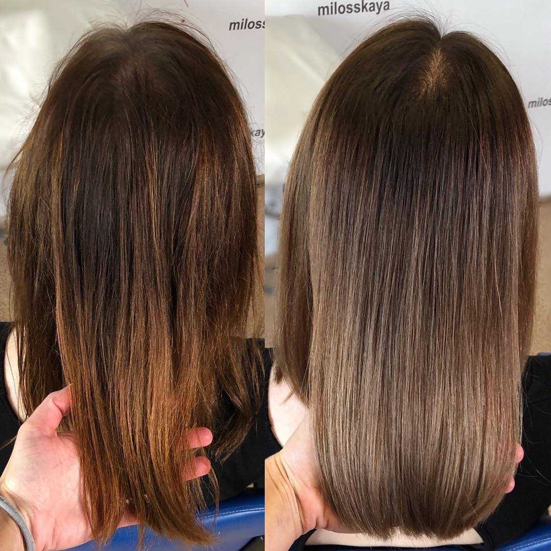 Разница до и после 3D-окрашивания не бросается в глаза сразу — с первого взгляда она может показаться едва уловимой (это вам не кардинальное преображение из брюнетки в блондинку и не окрашивание в розовый), но тем не менее выглядит очень существенной. Волосы смотрятся живыми и естественными, на них красиво играет свет, а прическа визуально кажется пышнее. Убедитесь сами!