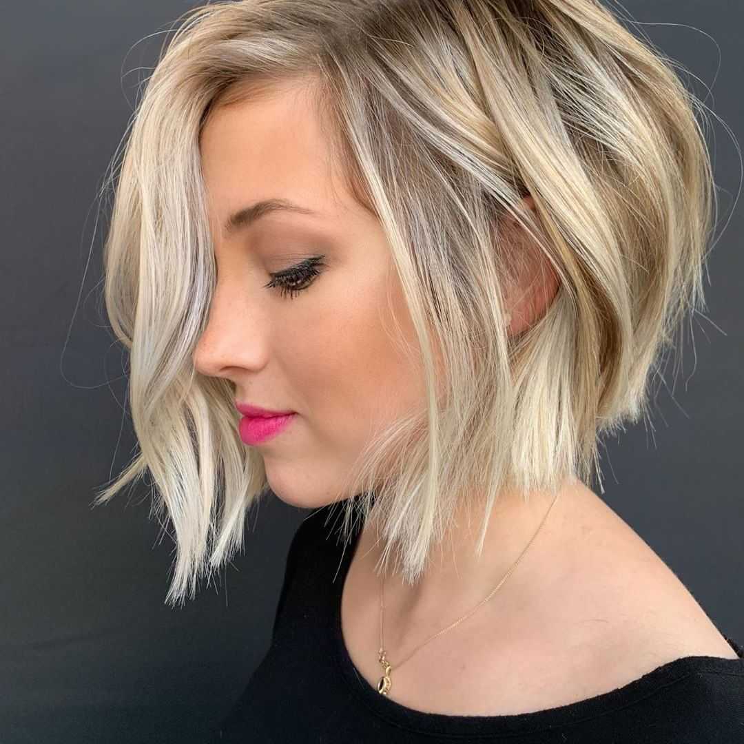 С помощью окрашивания балаяж возможно сделать акцент на легкой асимметричности короткой стрижки. К тому же, визуально добавить волосам еще больше объема. Светлые пряди у щек помогают сделать лицо более худым на вид.