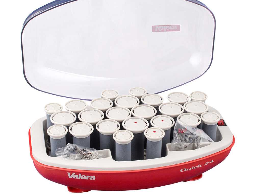 Большой комплект для изящной укладки волос, хорошо подойдет счастливым обладательницам густой шевелюры. В наборе электробигуди – 24 штуки: по 8 керамических роликов разного диаметра. К ним идут 2 вида фиксаторов: по 24 пластмассовых «краба» и металлические шпильки. Каждый цилиндр покрыт материалом, напоминающий велюр. Все составляющие сложены в удобный жесткий футляр, в котором предусмотрен отсек для хранения сетевого шнура.