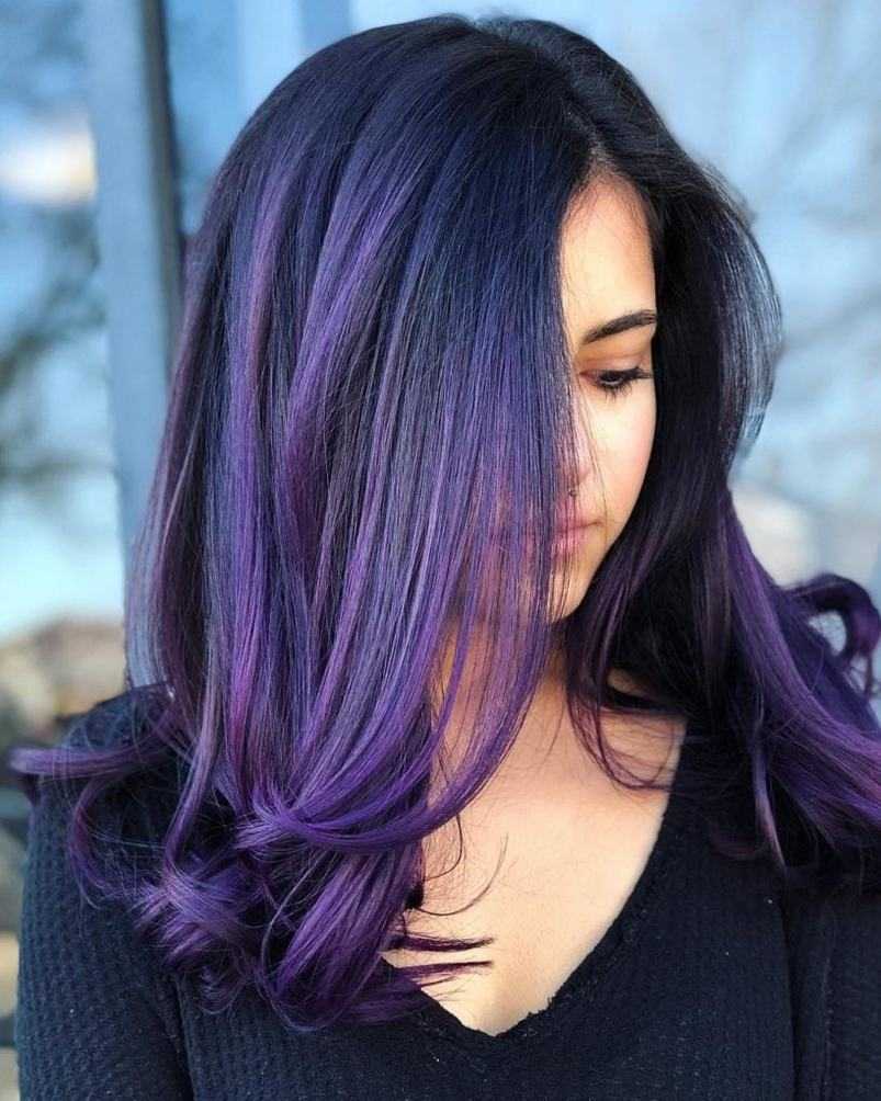 Темные лавандовые пряди — очаровательная альтернатива вашим естественным темным прядям. Глубокий фиолетовый оттенок постепенно превращается в милые лавандовые волны, является комбинацией, которую стоит попробовать.