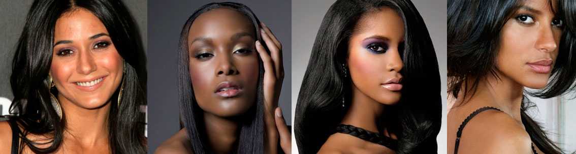 - смуглый цвет кожи бывает у девушек с темно-русыми и черными волосами, нередко встречается оттенок горького шоколада. Кардинальные перемены в данном случае ни к чему, но если хочется привнести новые нотки в образ, то расставьте акценты с помощью выделения отдельных прядок – они могут быть светлее естественного тона волос или рыжими, красными;