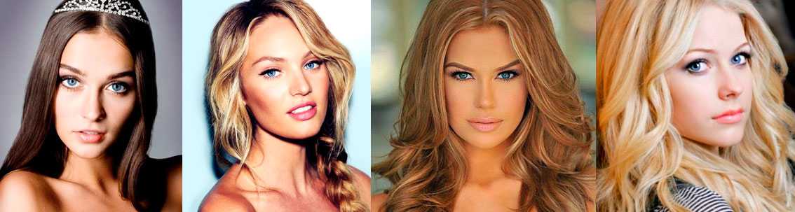 Голубые, синие, сиреневые. Цвет волос для голубых и синих глаз зависит от тона кожи. «Южные» голубоглазые девушки выглядят отлично с пшеничными, медовыми, карамельными, рыжеватыми волосами, тогда как «зимним» лучше обратиться к холодному блонду или черному цвету. Очень светлые глаза нельзя сочетать с насыщенными оттенками волос – взгляд потеряет глубину и станет блеклым.