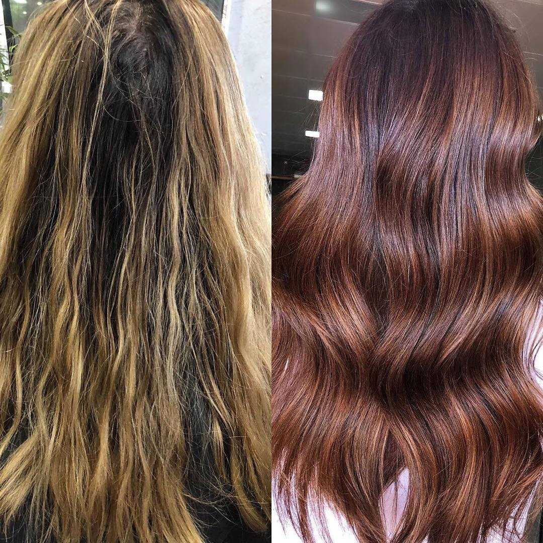 В первом примере цвет волос меняется навсегда, во втором — только временно. Если что-то пошло не так, желаемый оттенок будет изменен и приобретет желтый, красный, оранжевый или зеленый подтон (нюанс зависит от исходного цвета прядей). При высокой пористости волос на кончиках цвет может получиться существенно более темным, чем в прикорневой зоне.