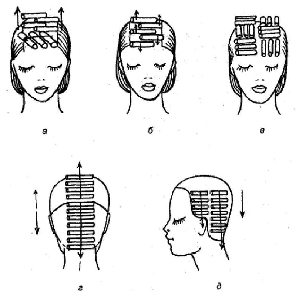 Чтобы химическая завивка получилась удачной, нужно правильно разделить волосы на части и расположить бигуди на голове в нужном порядке. Существуют разнообразные варианты расположения коклюшек. Вот некоторые из них.