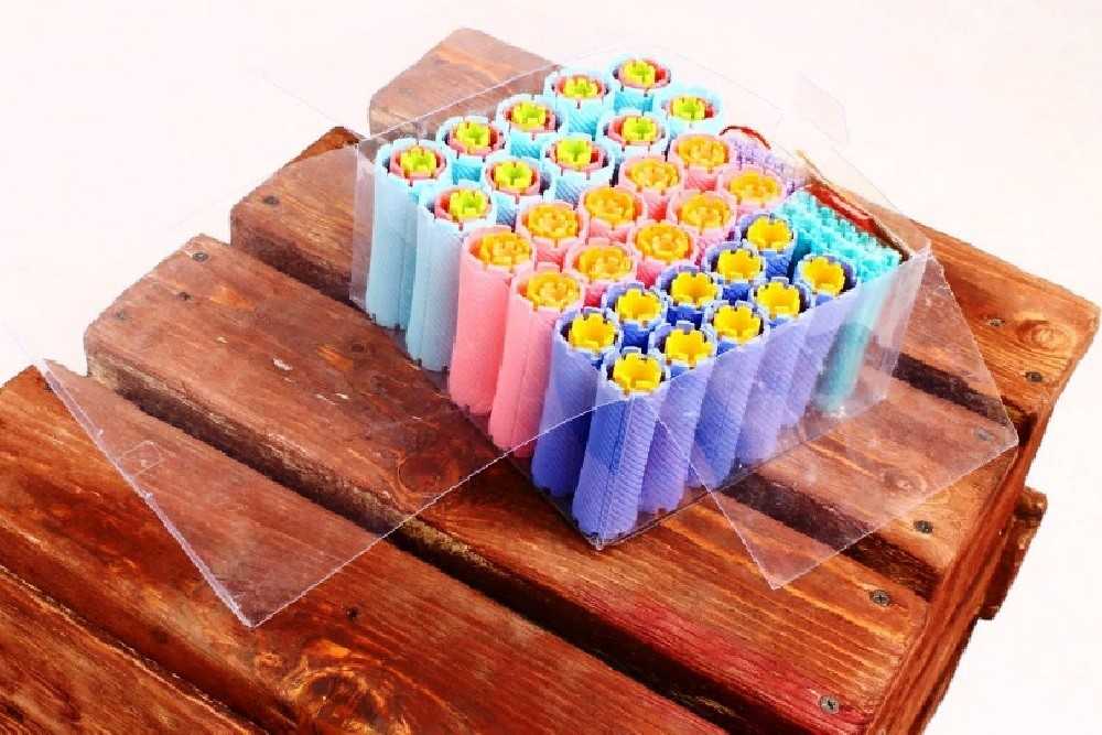 Японские палочки коклюшки, как правило, выполняются из высококачественного пластика. Они могут иметь разные диаметры. Чаще всего их применяют в процессе биозавики. Результат – мягкие локоны, очень похожие на естественные кудри. Набор из 54 штук стоит около 850 рублей, в нем представлены бигуди нескольких размерных вариантов.