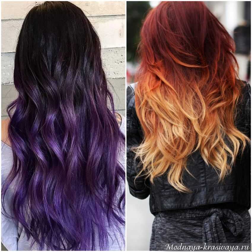 Омбре – это пир фантазии. Прическа может напоминать хвост павлина по используемым цветам, а может тяготеть к природным оттенкам. Переход всегда различим глазу: вот здесь заканчивается темный и начинается светлый. В классическом омбре эта линия слегка растушевана, и, тем не менее, присутствует. Современные экспериментаторы, в попытках расширить вариативный ряд, применяют и два, и три перехода, совмещая их с абсолютно противоположными позициями цветового круга. Например, у корней волосы могут быть черными, затем, в середине, красными, а концы — ярко-оранжевыми. Длинные, круто завитые локоны в таком исполнении можно сравнить с пляшущим на ветру пламенем.