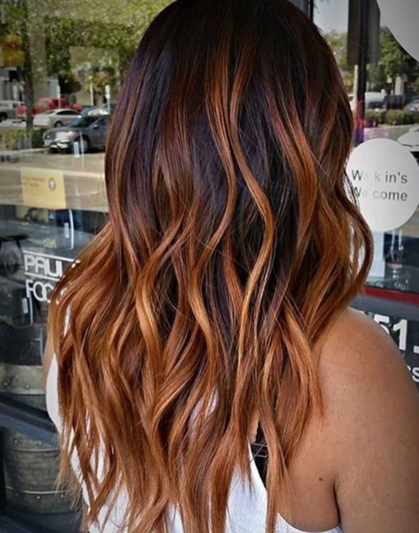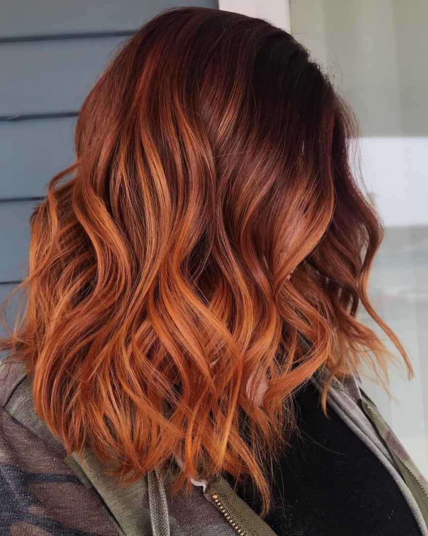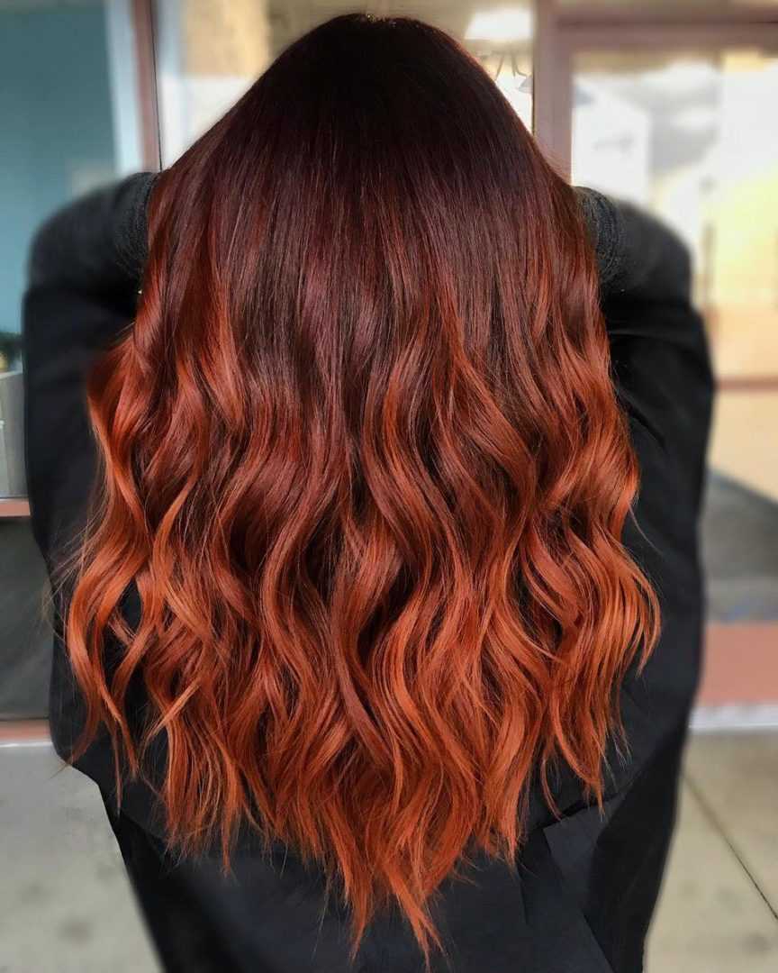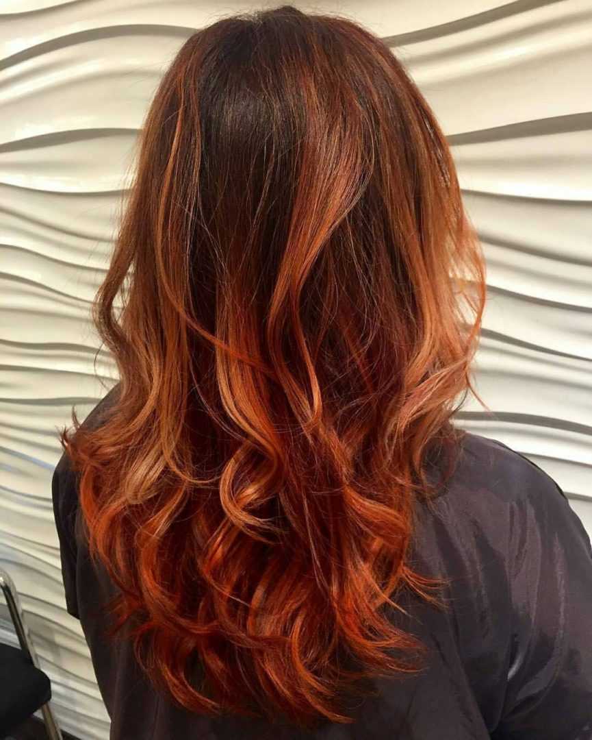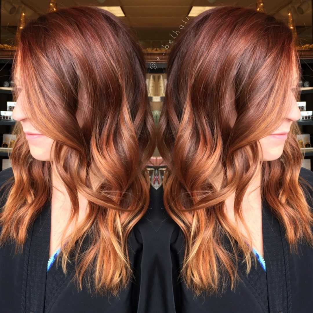 - Для волос с теплым подтоном можно попробовать сделать медное омбре, переходящее от темных шоколадных корней к оттенкам золотистой пшеницы или красной меди.