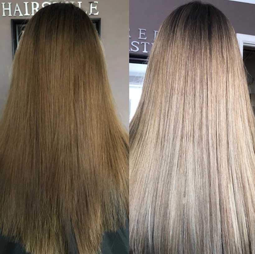 Посмотрите на результат До и После. Цвет выглядит очень натурально, нет четкого перехода от корней, очень плавная растяжка.