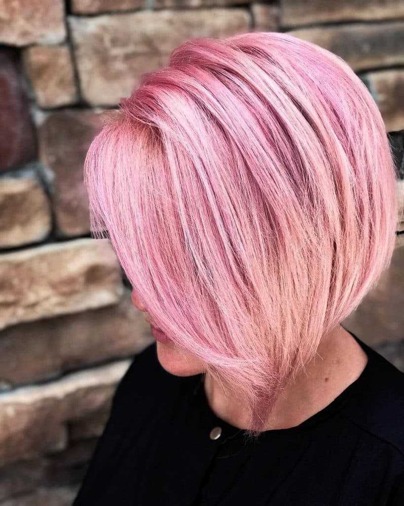 Светлые волосы с легкой розовинкой – красивый и модный тренд. Такой цвет называют клубничным блондом. Он отлично выглядит и на длинных и на коротких волосах. Получить его очень легко: достаточно добавить в краску розовый оттеночный бальзам подходящего цвета в количестве 5-10 капель.