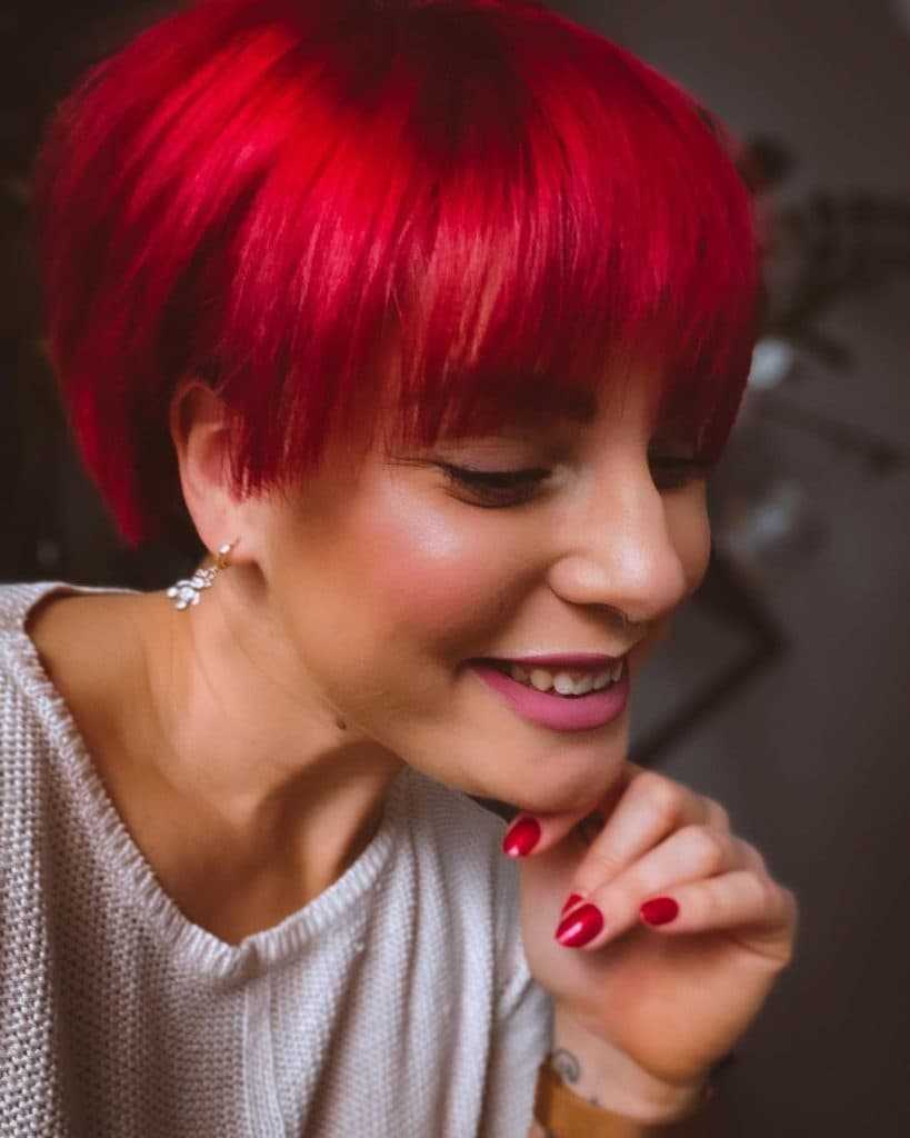 Красный, как известно, является смелым цветом, который быстро привлекает внимание. Если у вас короткие волосы, вы можете использовать этот цвет, чтобы выделить свою прическу и в то же время показать, что вы не боитесь быть смелыми и отличаться от других