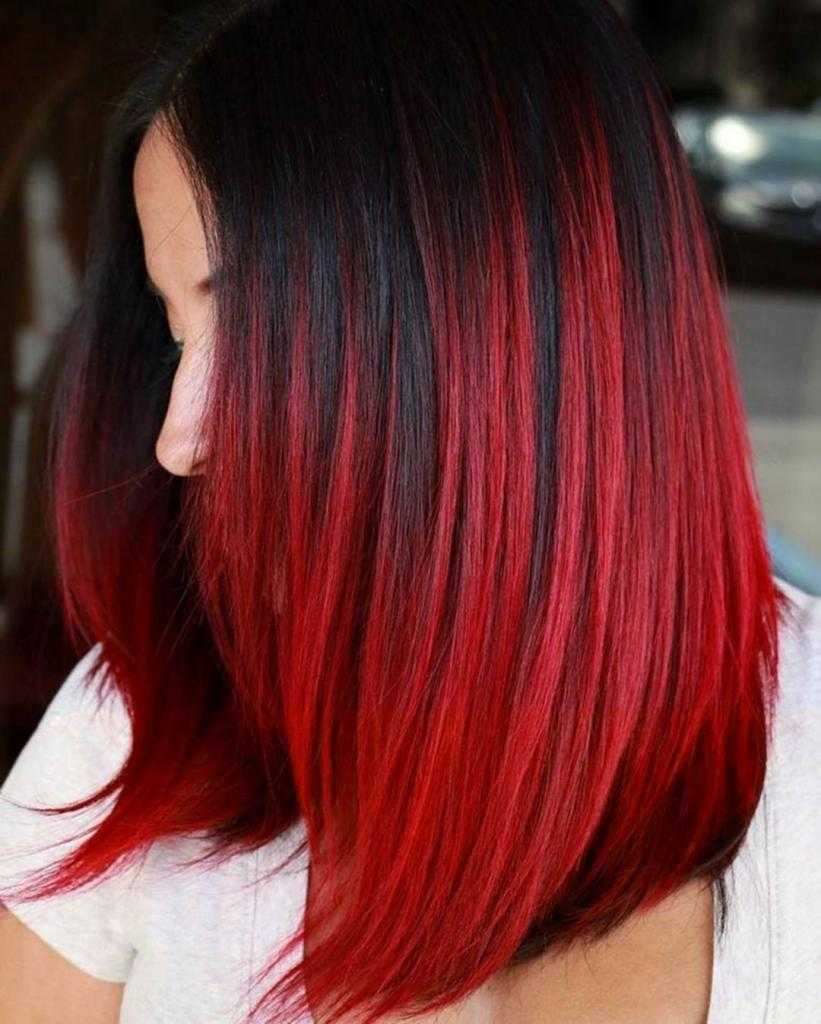 Красные пряди будут очень красиво и контрастно смотреться на темных и черных волосах. Это креативный и смелый метод мелирования, который впрочем, пользуется большой популярностью среди молодых девушек и женщин постарше.