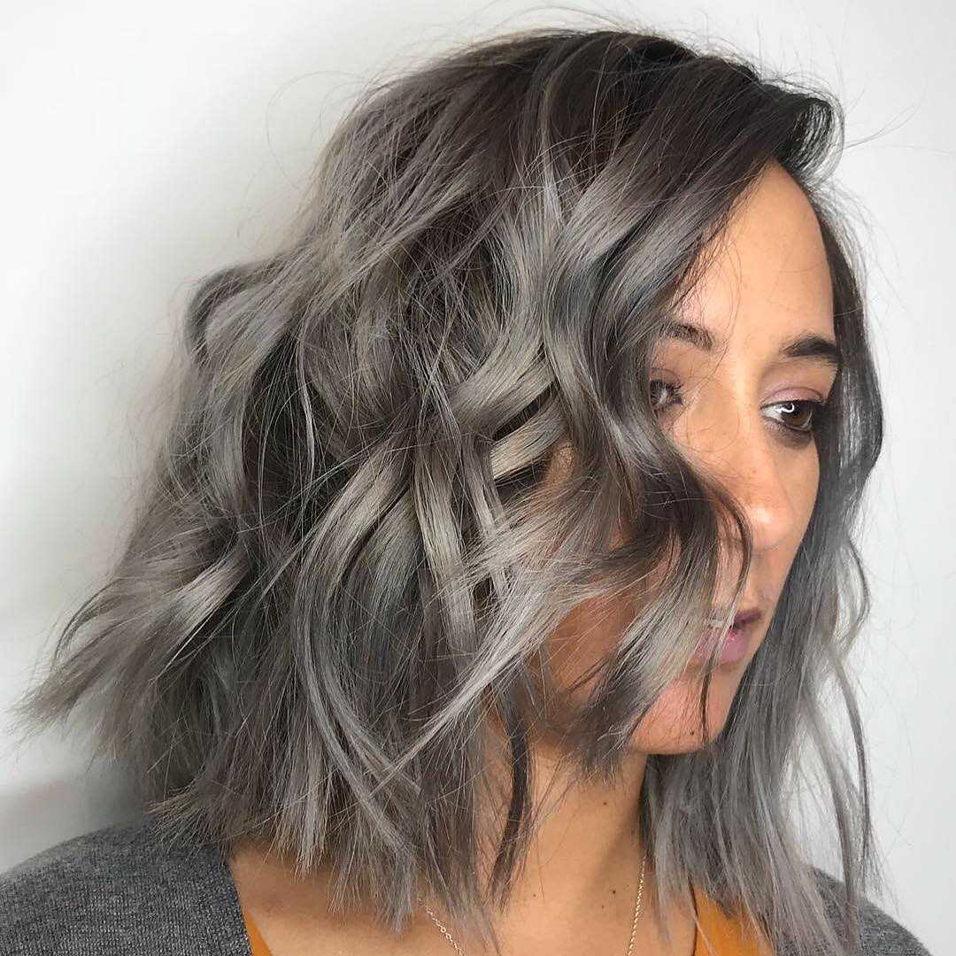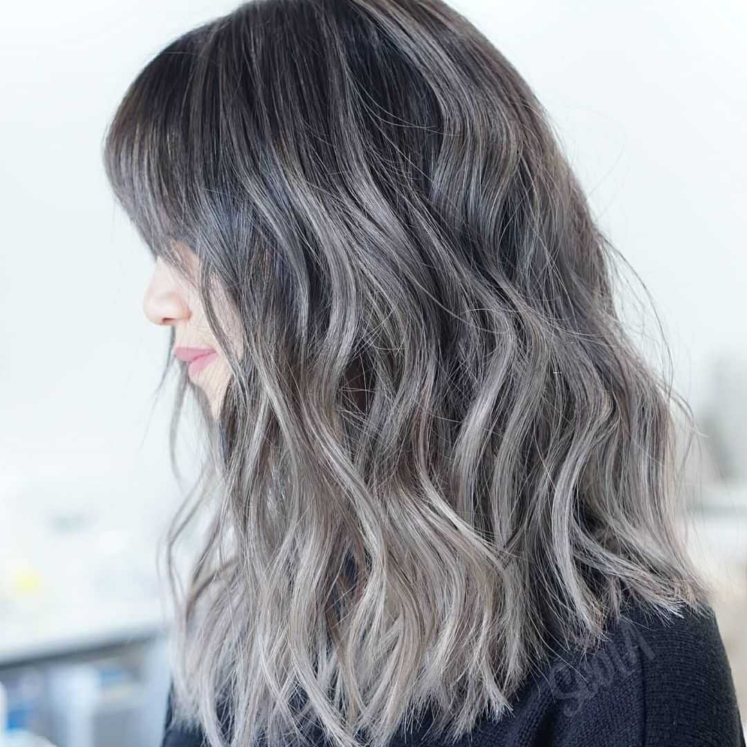 Чтобы пепельный балаяж на темных волосах смотрелся натурально, выбирайте не очень светлый оттенок: светло-серый или серый с легким коричневым подтоном будет в самый раз.