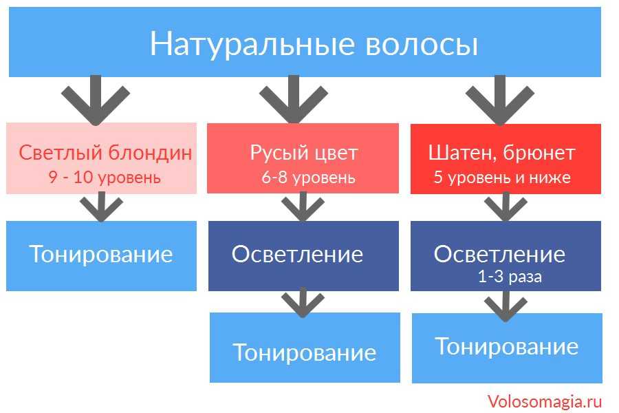 При темных оттенках натуральных волос сложно сразу получить хорошую чистую базу после осветления, поэтому необходимо проделать осветление 2-3 раза с промежутком 2-4 недели.