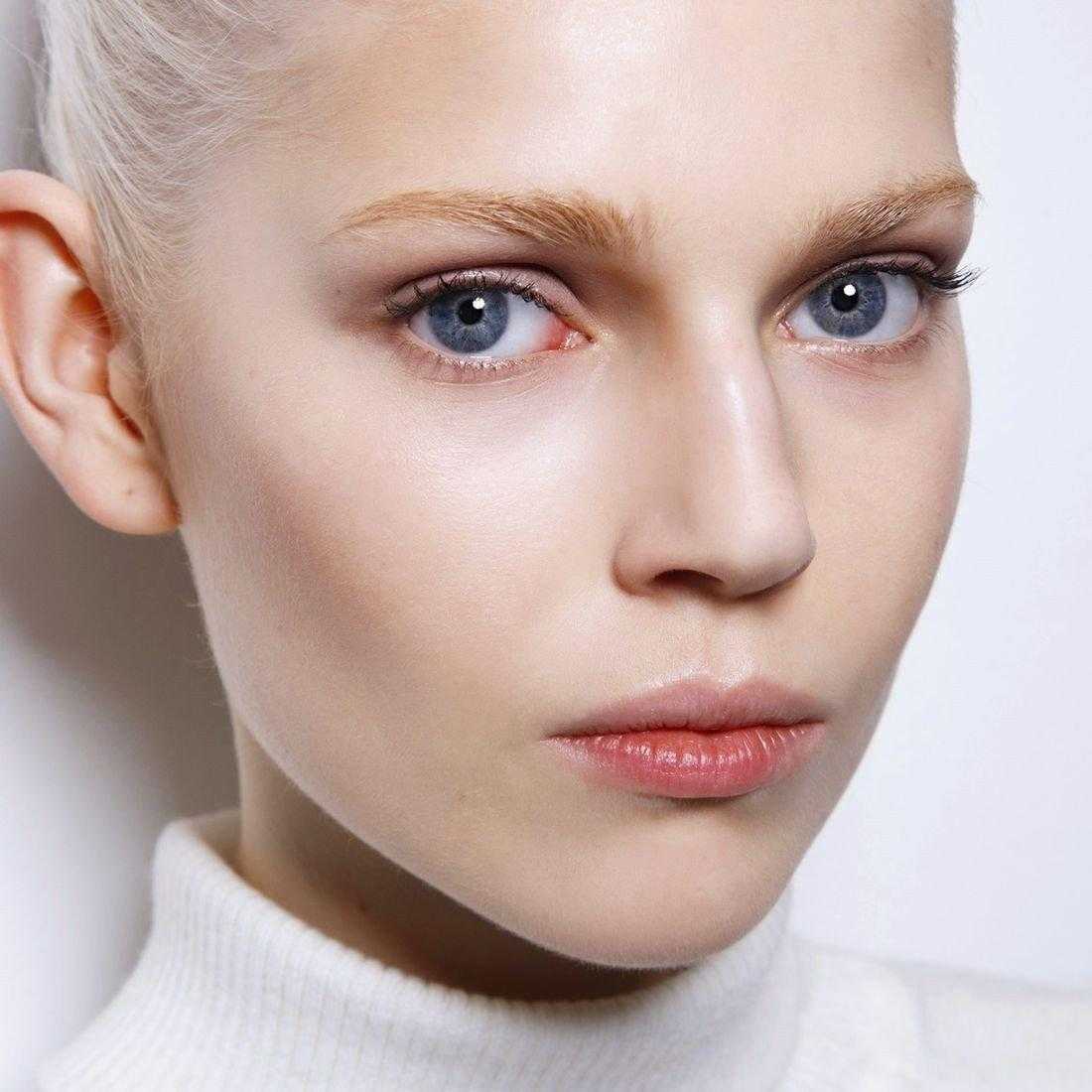 - Слишком яркий и вызывающий макияж с белыми бровями не сочетается. Визажисты не советуют выбирать насыщенные цвета теней и рисовать широкие стрелки.