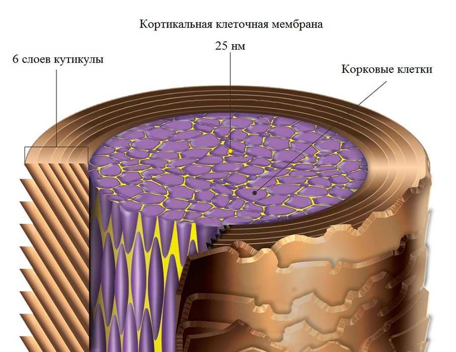 Эти слои отчетливо видны в анатомическом строении стержня волоса.