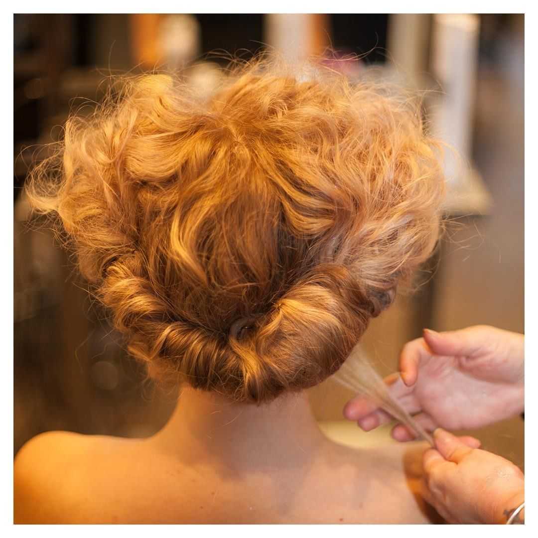 Нанести мусс для укладки, затем создать у корней объём, постепенно делая начес. Собрать волосы, закрепить заколкой средней величины. С помощью тонкой расчески поднять больше волосы на макушке. Закрепить лаком. Придать прическе небрежность руками.