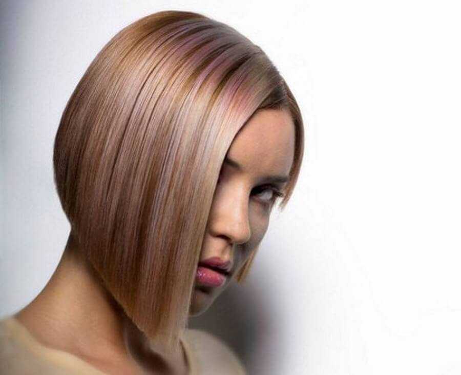 асимметричная используется для коррекции овала, дополняется боковым пробором, техниками окрашивания с затемнением и осветления прядей;