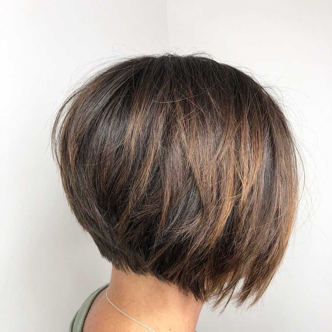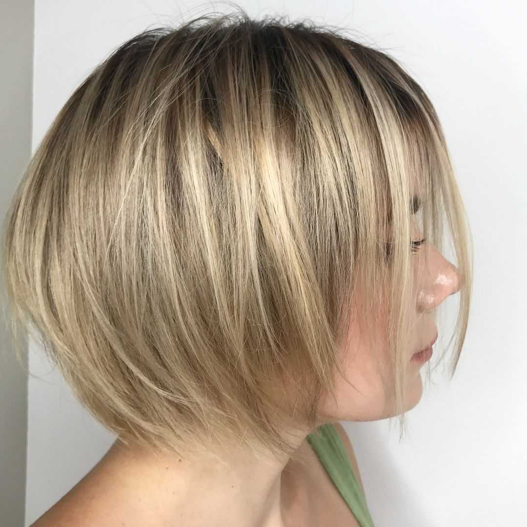 Градуированный боб без челки – достойный вариант для тех, кому важно спрятать очень пухлые щечки и существенно вытянуть само лицо.