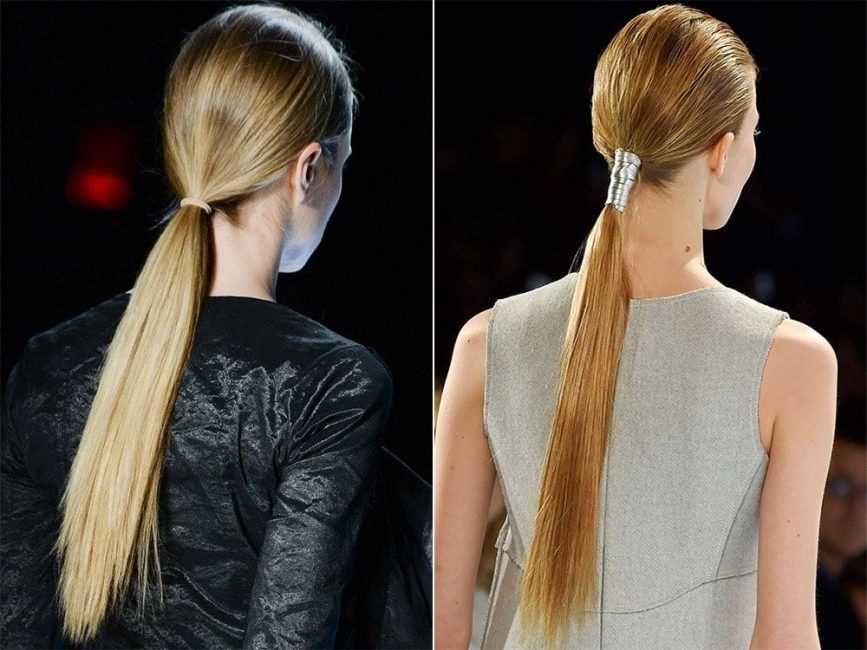 Низкий хвост на прямые волосы выгодно подчеркнет скулы и овал лица. Прямой или косой пробор придаст прическе особой элегантности. Его также можно перетянуть жгутом из пряди и скрепить заколкой, или подобрать резинку, подходящую по цвету к одежде. В последние годы наблюдается тенденция использовать для такого хвоста заколку с золотой или серебристой вставкой.
