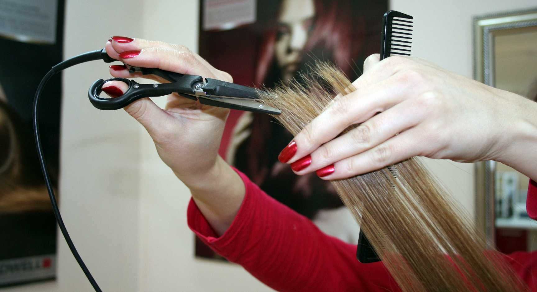 - Кончиками ножниц, под углом к пальцам, мелкими шагами начать состригать кончики по линии, сантиметр за сантиметром.