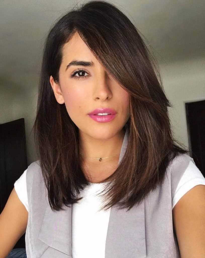 - Градуированные локоны с длинной ровной челкой, разделенной на косой пробор тоже актуальны в моде. Также можно смещать пробор в ту или иную сторону либо выполнять фигурно.