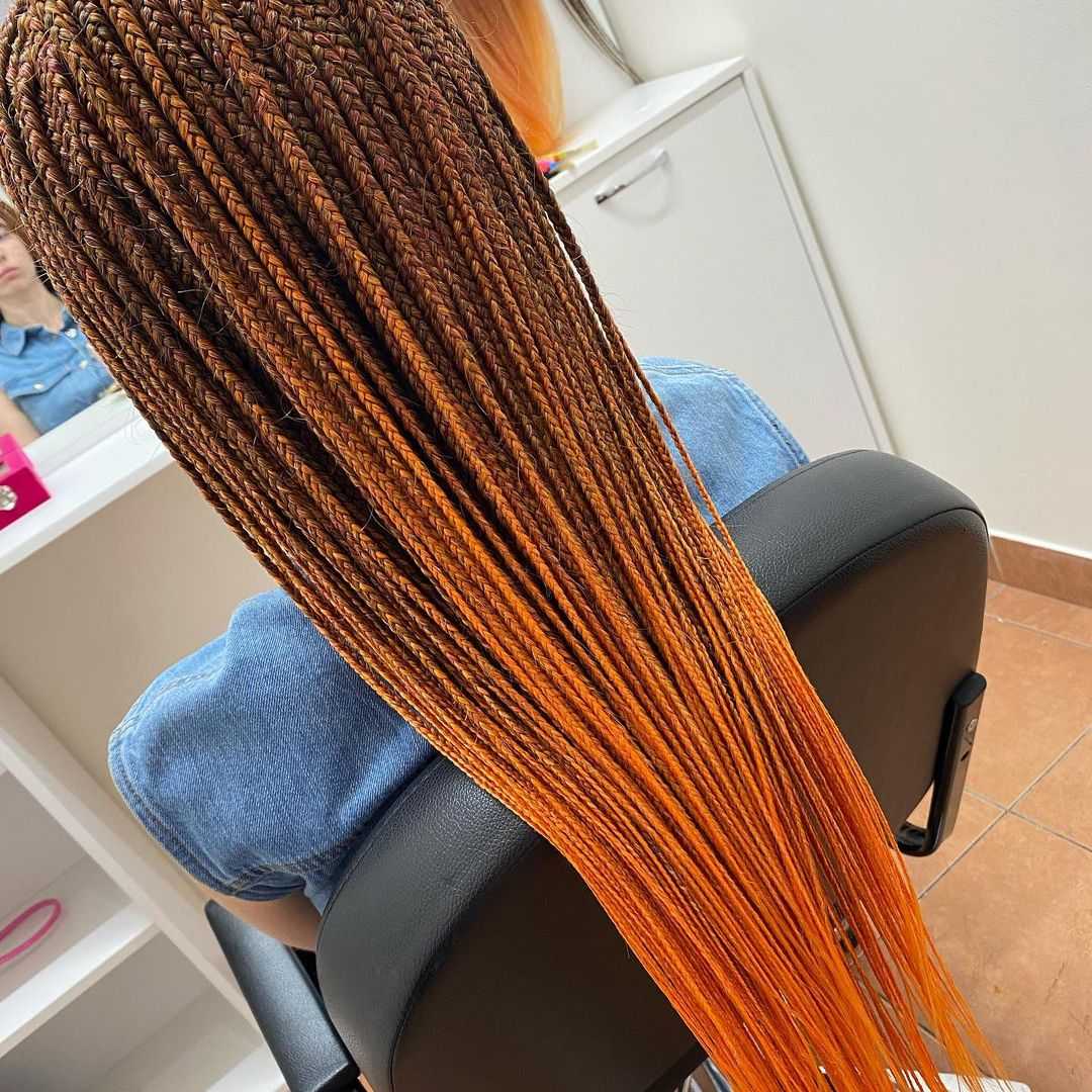 И снова нужна довольно темная база натуральных волос, не выше 5-го уровня тона. Рыжие зизи-косы сами по себе яркие и «громкие», но на них стоит посмотреть и как на безопасный способ выяснить, как вы себя ощущаете в медовом, тициановом или медном оттенке.