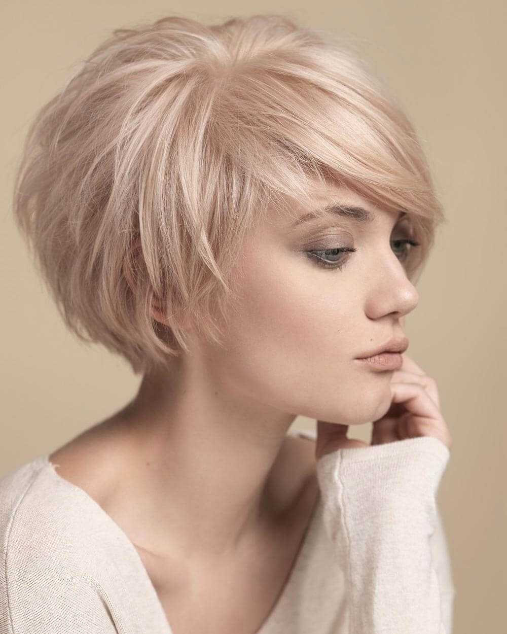 Круглолицым особам стоит обратить внимание на вариант длиной до скул с асимметричной челкой и объемом на макушке. Пикси на короткие локоны станет хорошим решением и для особ с квадратным подбородком