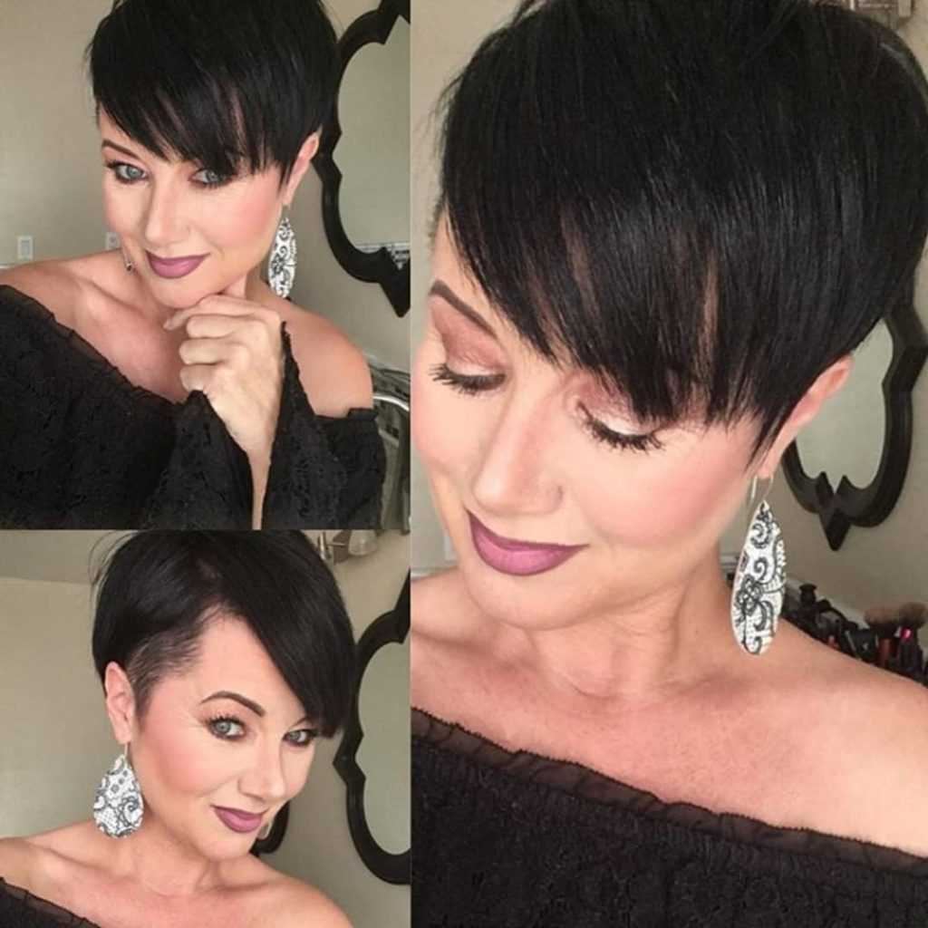 Пикси – это яркая, эффектная стрижка для уверенных в себе леди. Они подходят любому возрасту, освежают лицо, подчёркивает его черты. Прямая чёлка становится интересным дополнением стрижки.