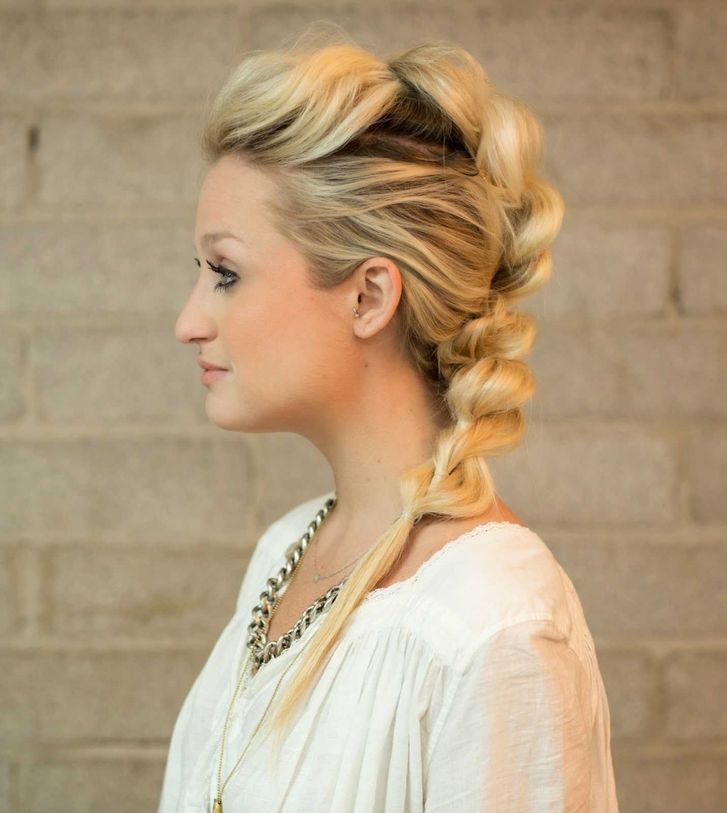 Шикарная идея для вечеринки — сделайте боковой пробор и отделите три пряди сбоку, которые затем закрутите в тугие жгуты, подколов невидимками под основной частью волос. Челку уложите на бок, волосы слегка закрутите в локоны.