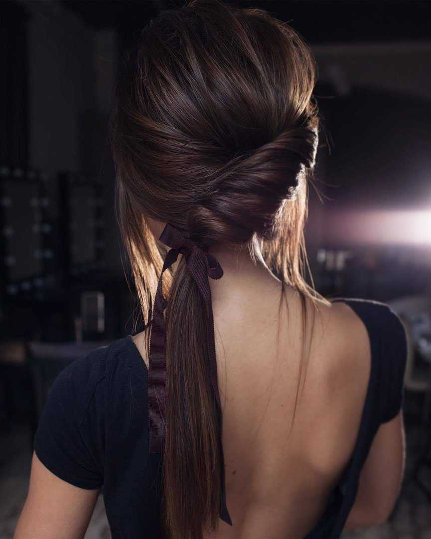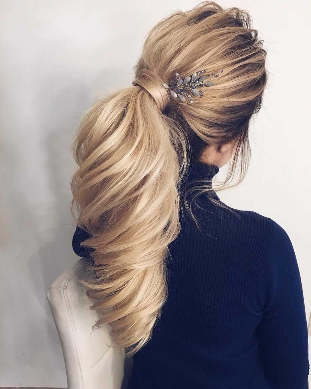 Еще один вариант укладки длинных волос, который впрочем, выглядит более расслабленно и непринужденно. Хвост располагается сзади, ниже затылка, основной акцент сделан на элегантный начес.