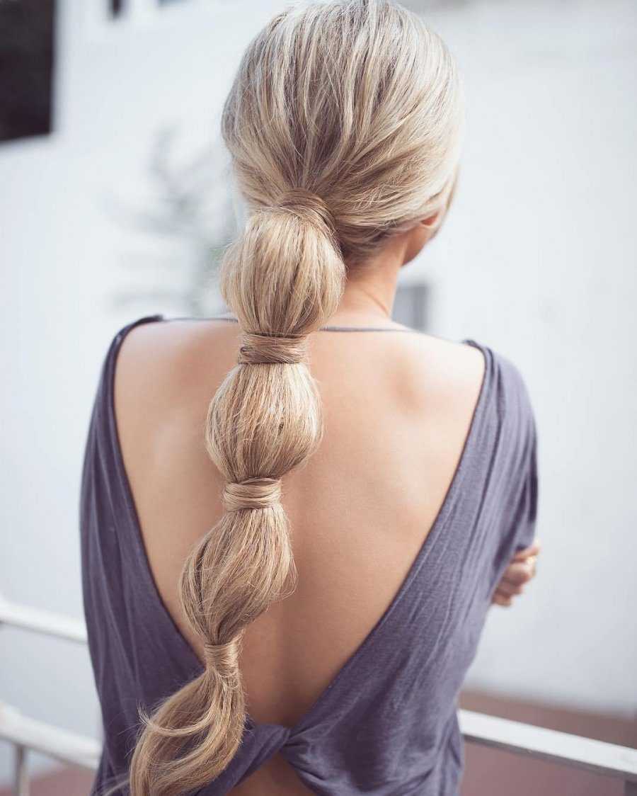 Хвост в виде гирлянды (фонарика) выглядит необычно и женственно. Сделать такую укладку не составит труда. Волосы собираются в высокий хвост, а на конец с равными отступами завязывается по резинке. При создании прически используются до 5 или больше резинок.