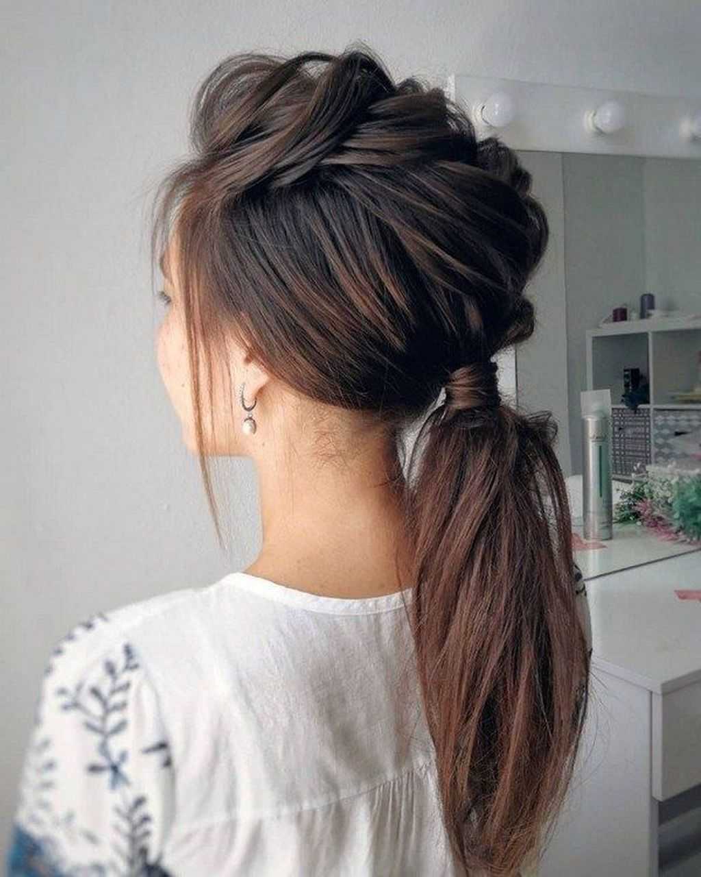 Стильная, простая в исполнении, прическа, состоящая из пучка, зафиксированного резинкой, концы которого заплетены в косу и так же зафиксированы, великолепно выглядит на волосах каштанового оттенка