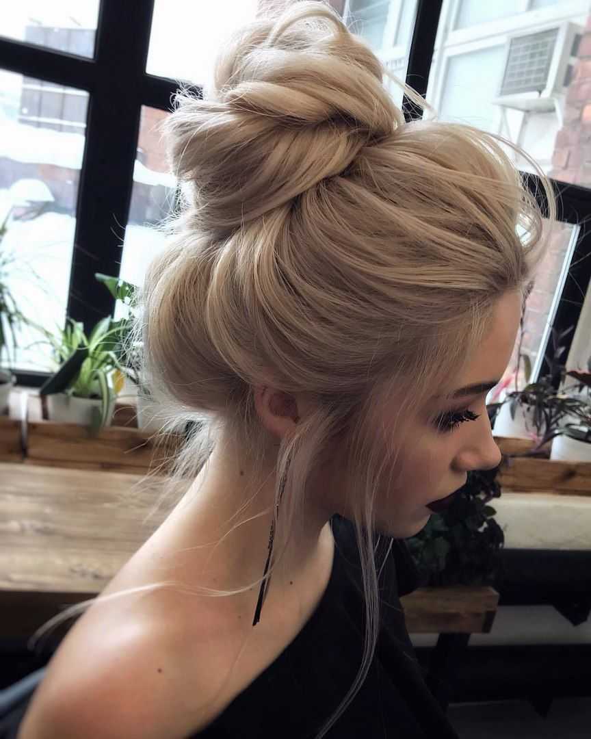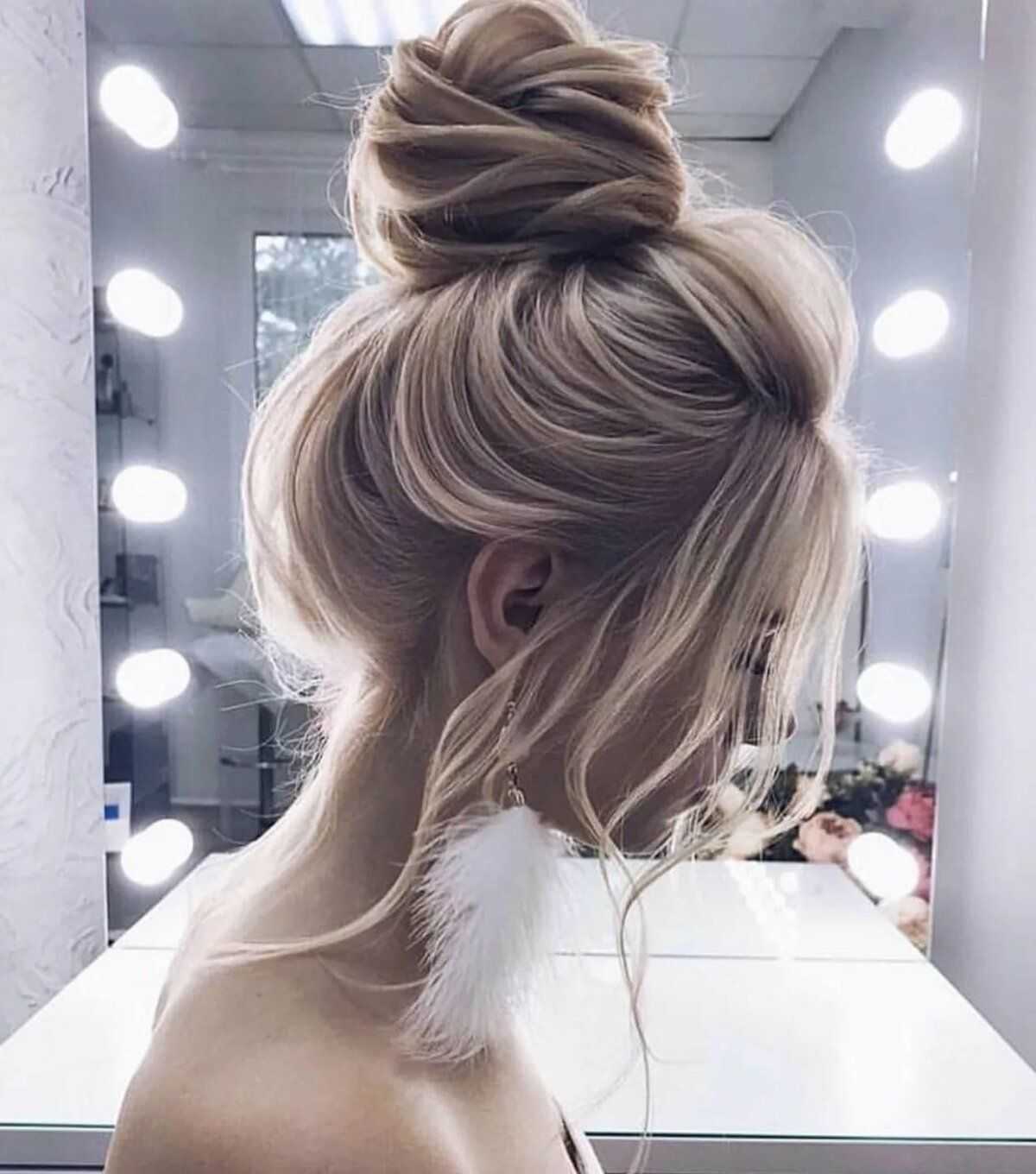 Если длина волос позволяет, то можно выполнить на пучке бантик или обвернуть его косичкой. Такая прическа выглядит красиво и стильно, а девушке будет гораздо удобнее справляйте с такой укладкой.