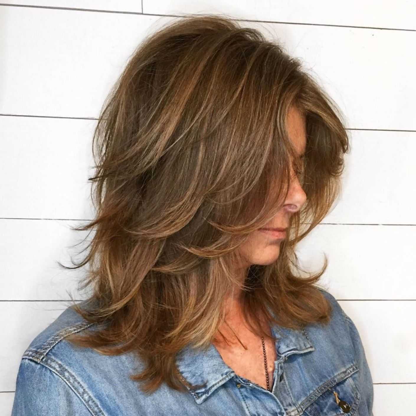 Волосы в ухоженном состоянии без намека на секущиеся концы легко преобразить слоистой стрижкой в дуэте с рваной челкой. Такая комбинация не только зрительно увеличит пышность прядей, но и добавит образу легкой омолаживающей небрежности.