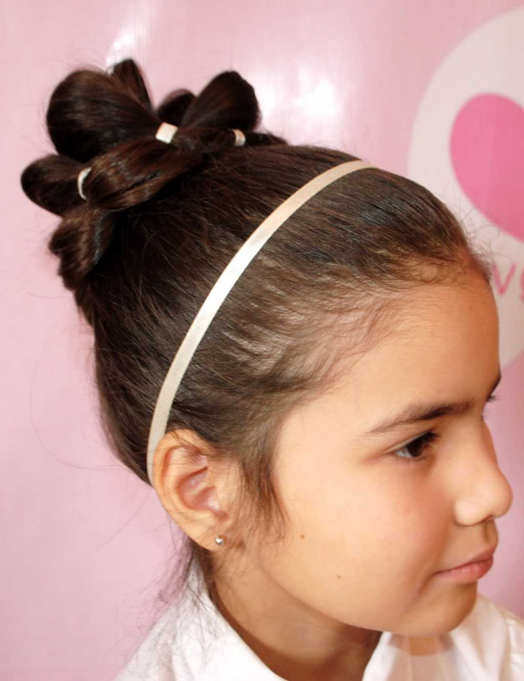 - Локоны, которые остались возле лба, «завяжите в бант. Для этого сформируйте три хвостика. Два боковых аккуратно заверните внутрь и заколите. Центральным перевяжите посередине так, чтобы получился желаемый элемент.