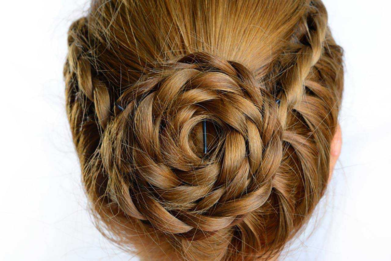 - Скрутите свободный хвост косы в цветок и закрепите его на затылке при помощи шпилек.