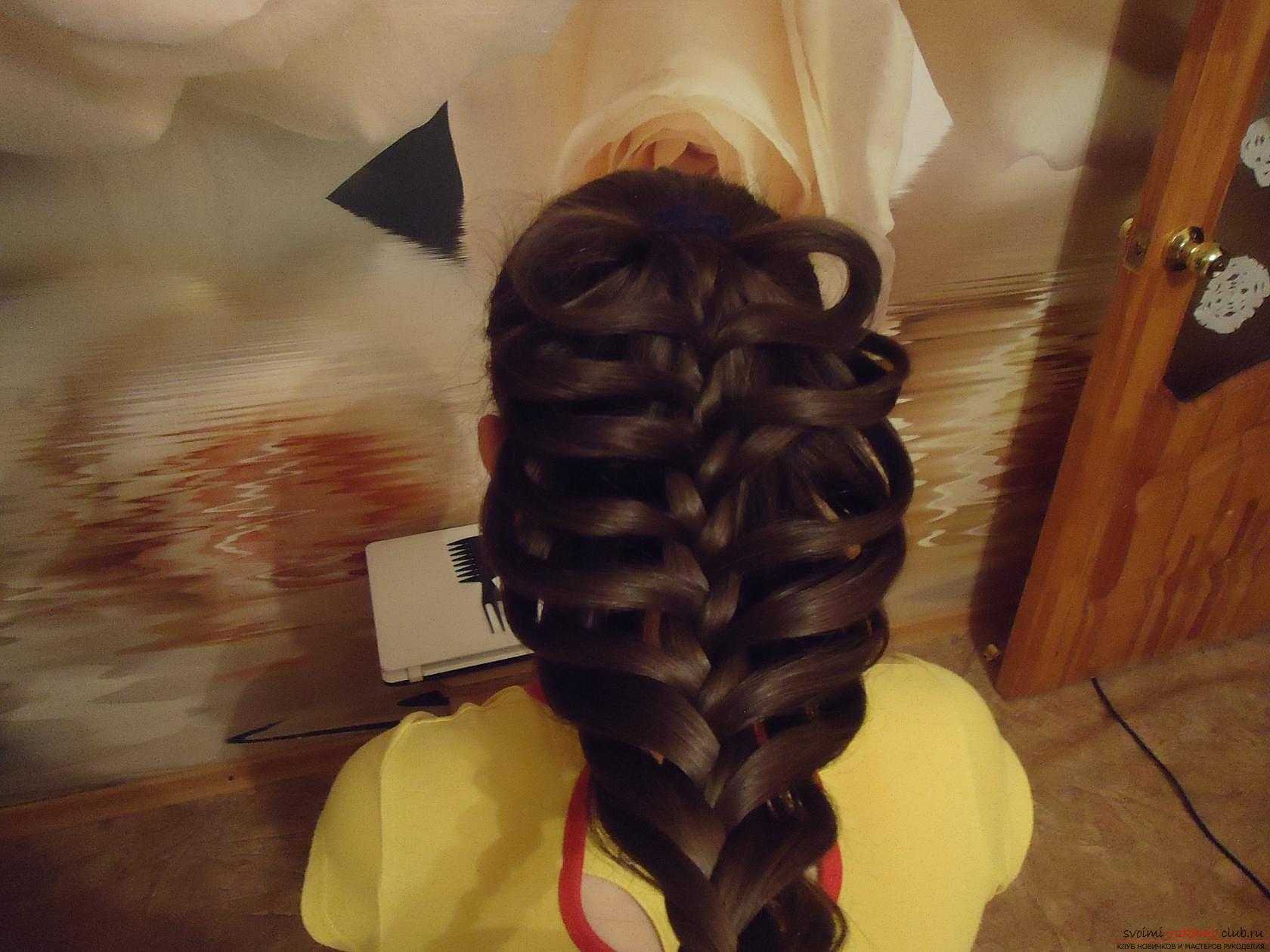 - После окончания плетения, «лесенку» можно закрепить резинкой, чтобы не распустилась, а можно оставить волосы распущенными.