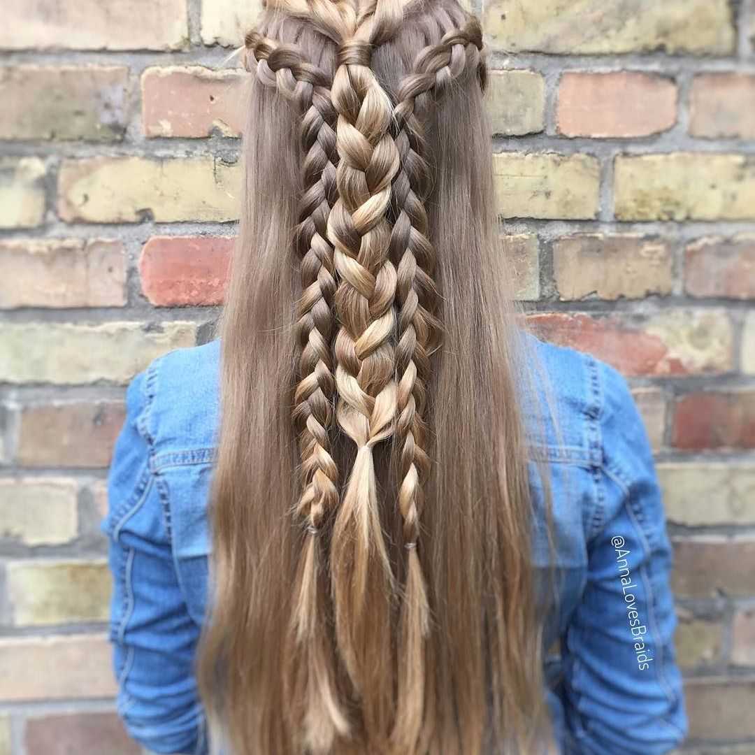 При большом объёме шевелюры можно разгуляться и выполнить причёску из трёх уже готовых кос. Это будет смотреться красиво и необычно.