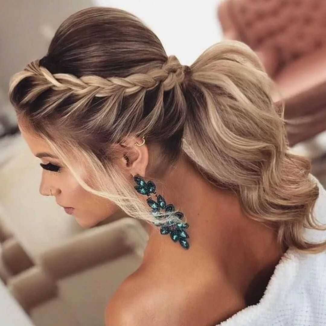 Придать образу романтичность и изящность поможет обычная французская коса, небрежно выполненная набок из небольшой части волос у лба. Хвост косы аккуратно зафиксирован невидимками. Смотрите подборку фото — прически с косами.