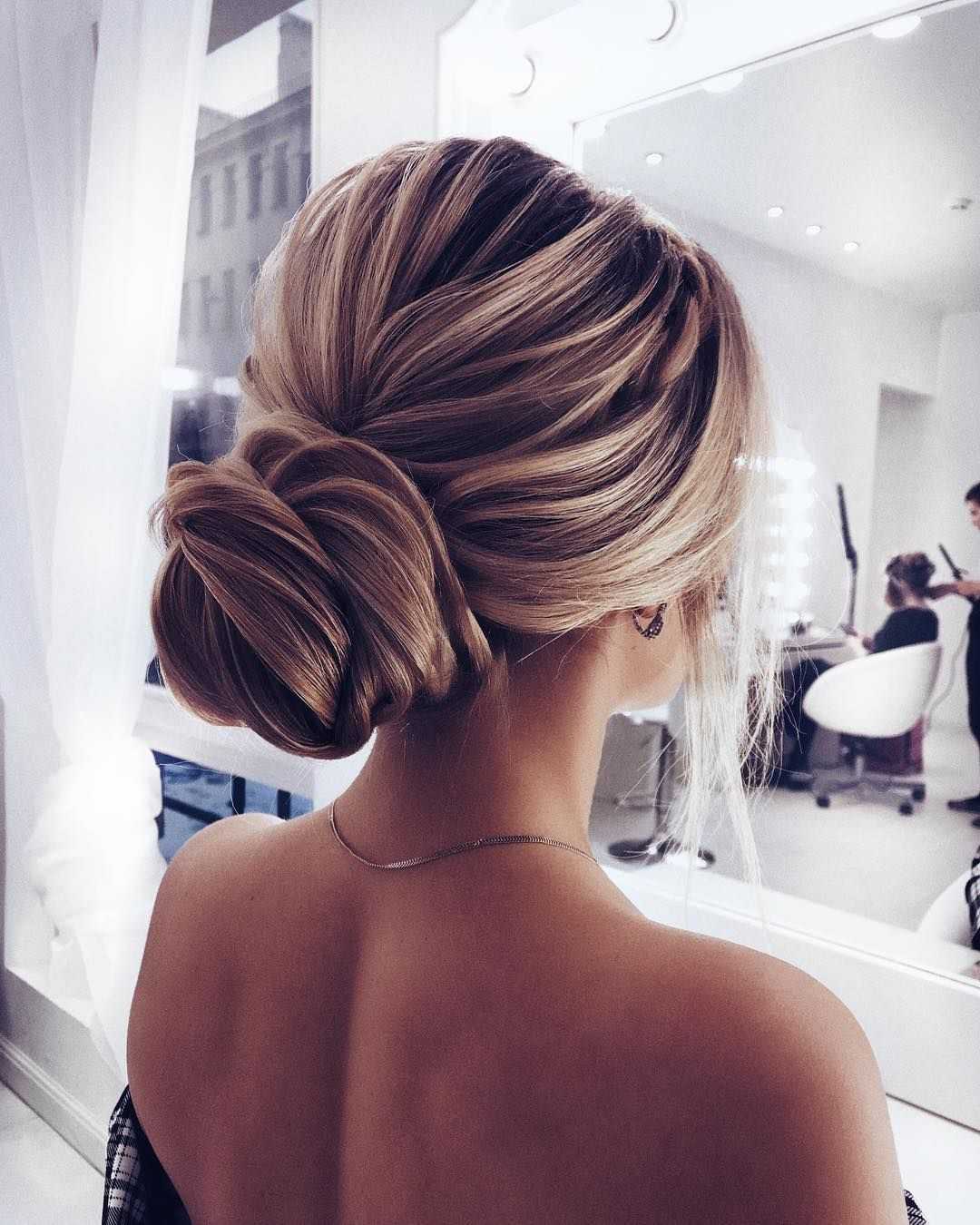 Для начала нужно уложить волосы назад, выделить прядь в верхней части головы. Создать из нее косу, но только не середине, а паве. Затем из локонов в нижней части также создать косу по центру, ее свернуть в пучок. Верхнюю косу использовать, чтобы обернуть гульку, а зафиксировать все при помощи невидимок.