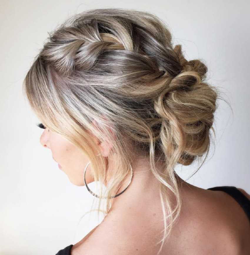 Красивый, небрежный пучок на средние или короткие волосы подходит на день рождения, свадьбу или другой праздник. Отличительные особенности — асимметричность и легкость. Для создания используется лента или ободок. Лента помещается на затылочную часть, каждая прядь оборачивается вокруг нее и в конце фиксируется заколкой. Небрежный пучок на средние волосы своими руками делается с парой прядей спереди. Они должны небрежно свисать у висков. Можно слегка завить их.