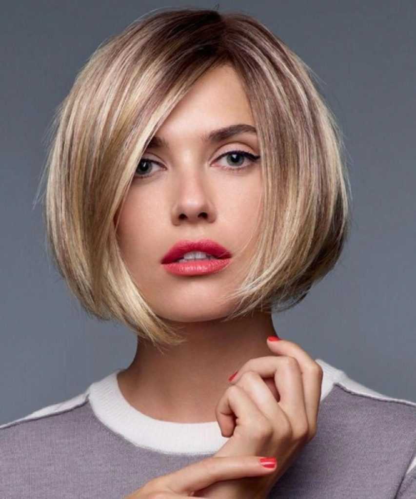 Безусловно, короткий боб прекрасно подходит для тонких волос. Стрижка позволяет создать прикорневой объем на макушке, что помогает приблизить круглое лицо к овальной форме.