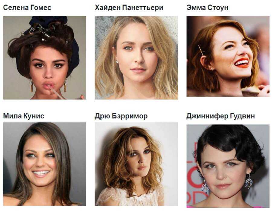 Квадратные лица во многом схожи с прямоугольными, но немного уступают им в вытянутости. Основная задача — округлить очертания, а также зрительно вытянуть форму, чтобы придать больше женственности, романтичности.