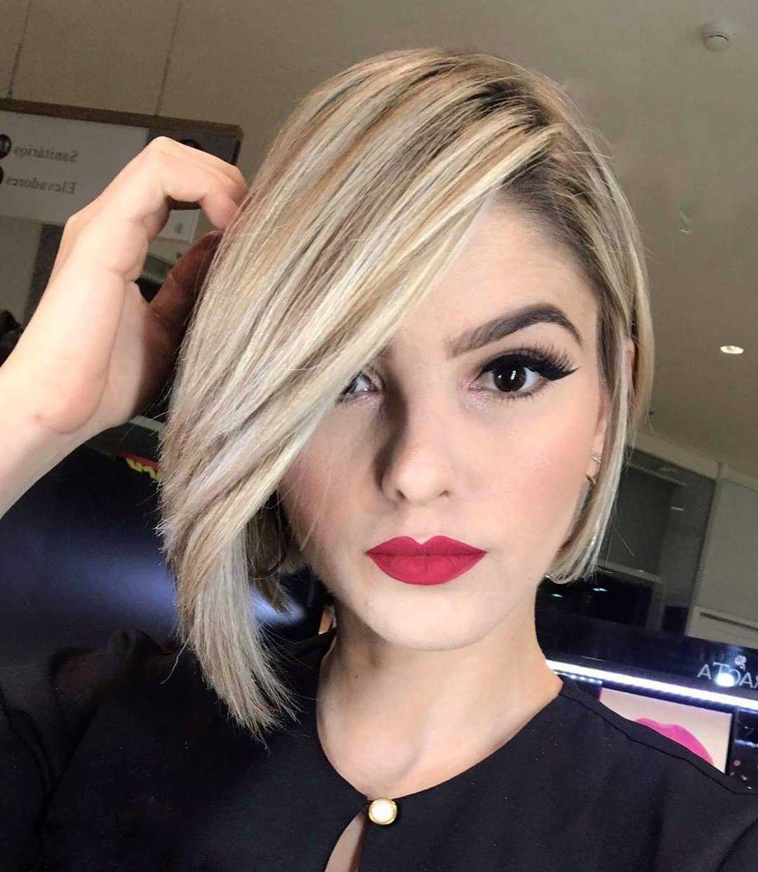 На фото – стрижки для круглого лица с удлиненной косой челкой, которая скрывает значительную часть лица с одной стороны и визуально стройнит: