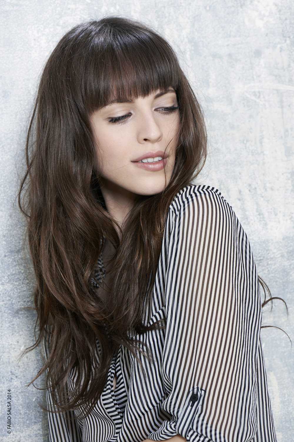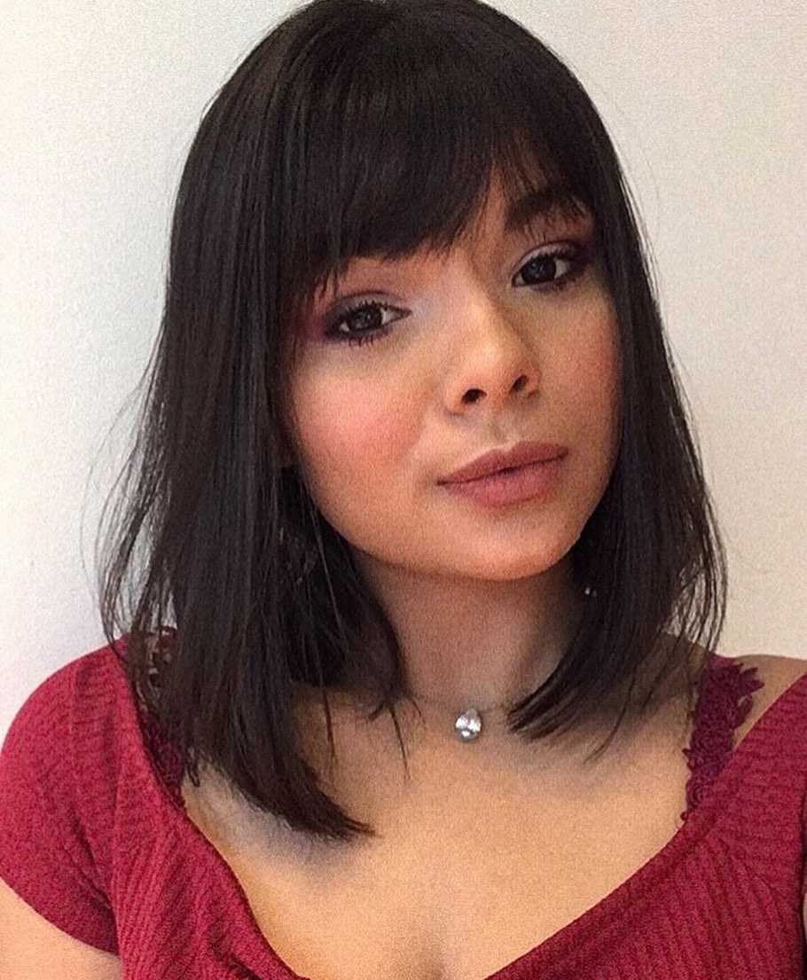 Удлиненный вариант стрижки, например, каскад или ровный срез, прекрасно смотрится как с длинными, так и челками средней длины. Особенно, если линия челки рваная, удлиненная в один край, что добавит романтики и нежности в образ.