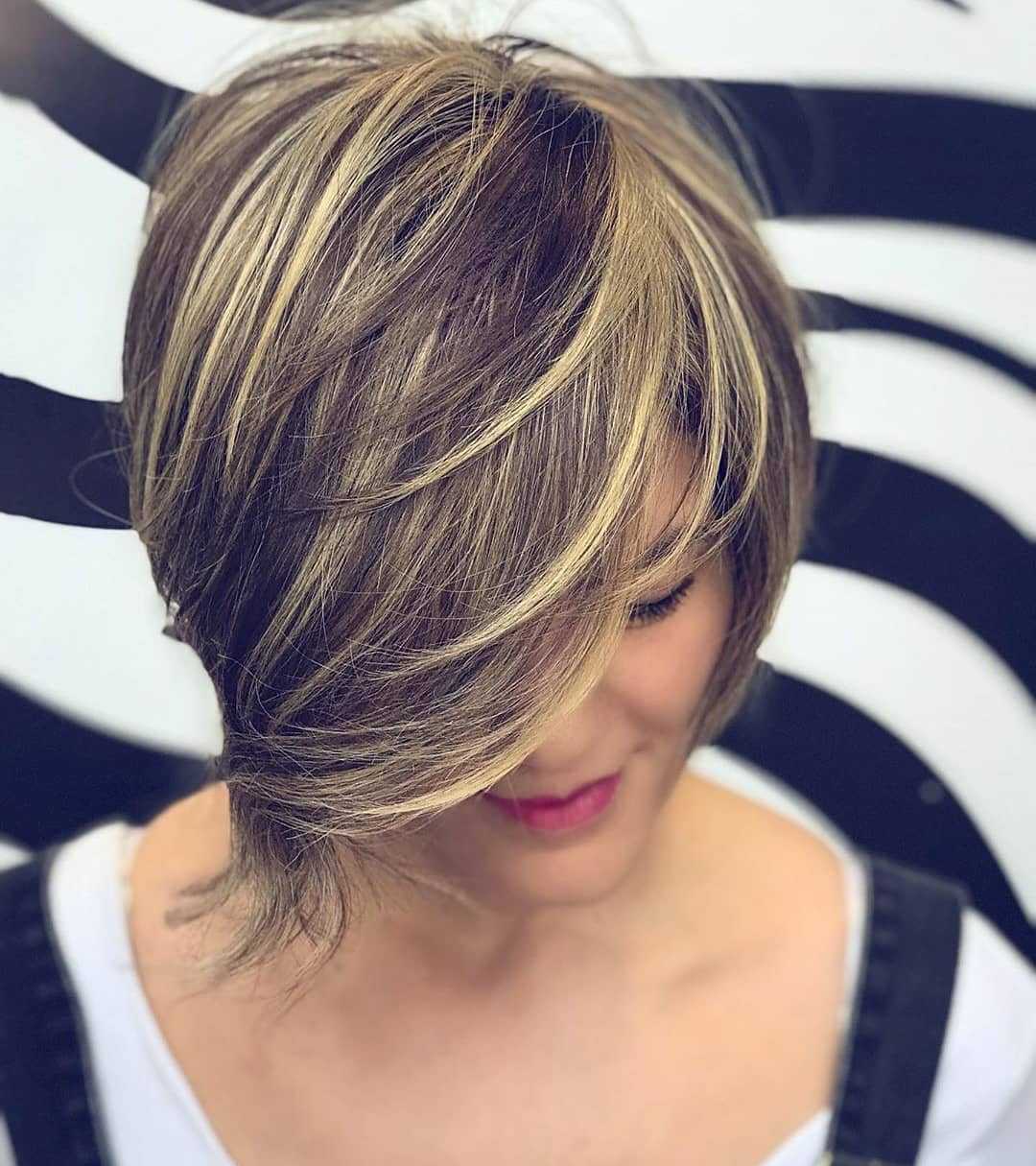 Вам подойдет короткая женская стрижка с длинной косой челкой – фото показывает разновидности пикси и боба, в которых передние пряди частично скрывают широкий лоб: