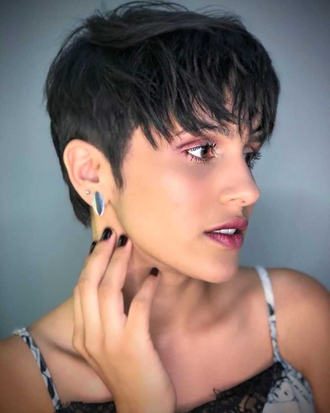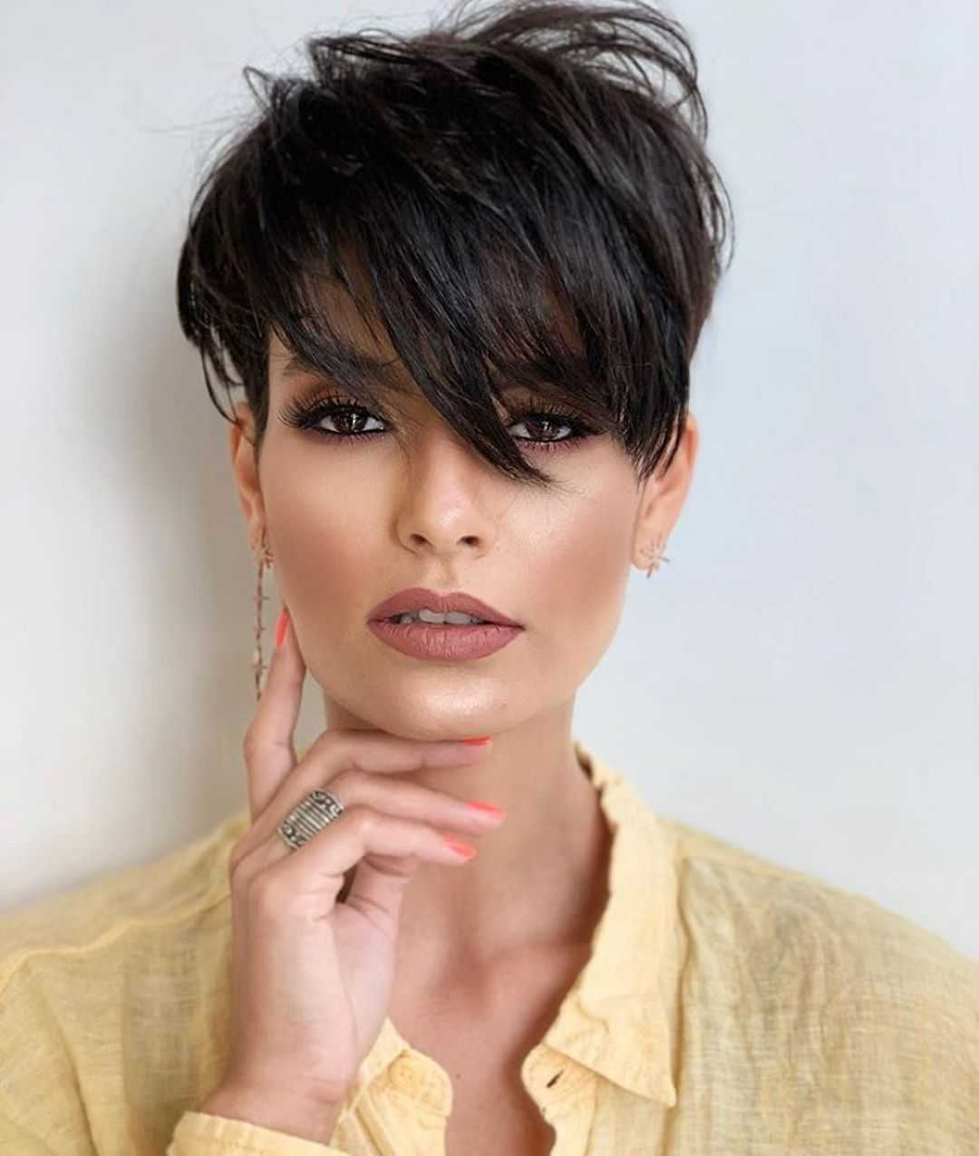 Пикси чаще всего делают именно с косым чубом, ведь чем длиннее передние пряди пикси, тем эффектнее она смотрится.